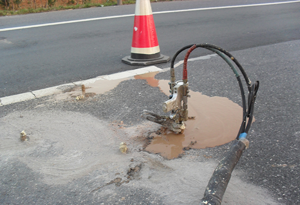 采用專業(yè)高壓注漿設(shè)備把含有多種礦物質(zhì)改性組分的高分子聚合物材料注入路面脫空位置,材料反應(yīng)后發(fā)生輕微膨脹并快速凝固,終凝強(qiáng)度大大高于普通高聚物注漿和水泥注漿。在處理基層脫空病害的同時(shí),對(duì)結(jié)構(gòu)層中網(wǎng)狀裂縫也能起到很好的填充作用,施工完畢無需養(yǎng)生即可恢復(fù)道路通行?! ∵m用范圍:路基、基層的翻漿、唧泥;由于路基沉陷而造成的基層脫空;由于路基原因造成的基層及路基縱向裂縫。