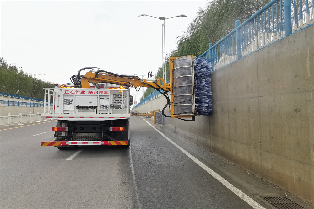 萬里交科路太養(yǎng)路機(jī)械公司推出的墻面清洗車(隧道壁清洗車)適用于隧道壁面、隔音屏內(nèi)側(cè)、外墻面等道路交通設(shè)施清洗作業(yè)。是在一汽解放18噸二類底盤基礎(chǔ)上改裝而成,由底盤、水箱、動(dòng)力箱、前刷、后刷、中沖、操作室、控制系統(tǒng)等主要部件組成。