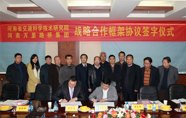2011年11月10日,河南省交通科學(xué)技術(shù)研究院與河南萬里路橋集團戰(zhàn)略合作框架協(xié)議簽字儀式在集團會議室舉行。河南省交通科學(xué)技術(shù)研究院院長胡霞光、市場經(jīng)營部部長李禹德、道路所所長宋云祥、工程所所長呂西方等領(lǐng)導(dǎo)及河南萬里路橋集團董事長張良奇、總裁付建紅、黨委書記張海濱等領(lǐng)導(dǎo)參加了簽字儀式。