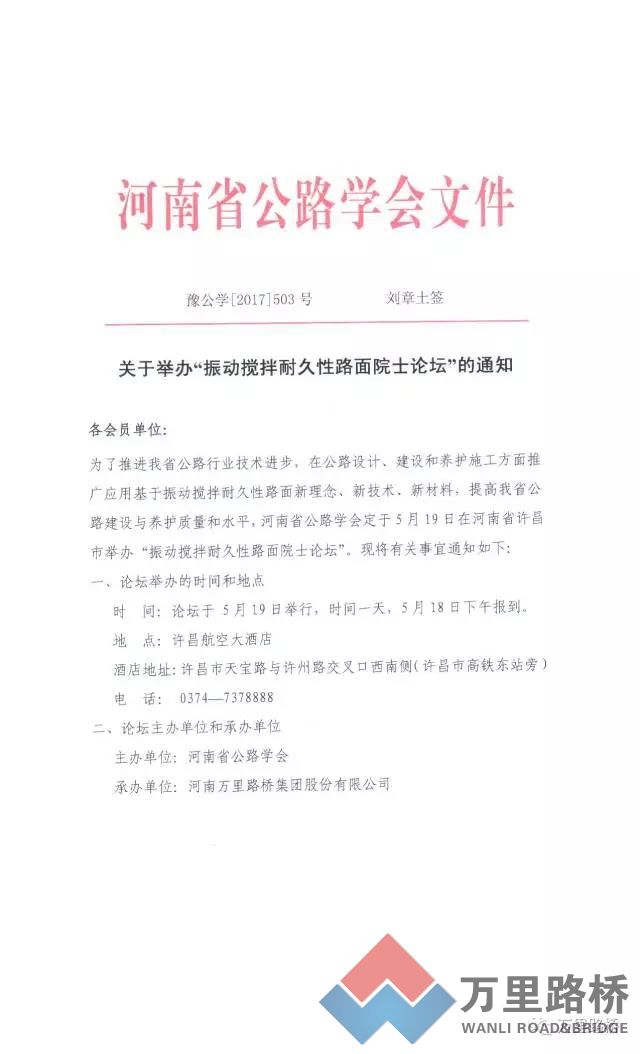 為了推進我省公路行業(yè)技術(shù)進步,在公路設(shè)計、建設(shè)和養(yǎng)護施工方面推廣應(yīng)用基于振動攪拌耐久性路面新理念、新技術(shù)、新材料,提高我省公路建設(shè)與養(yǎng)護質(zhì)量和水平,河南省公路學會定于5月19日在河南省許昌市舉辦“振動攪拌耐久性路面院士論壇”?,F(xiàn)將有關(guān)事宜通知如下:
