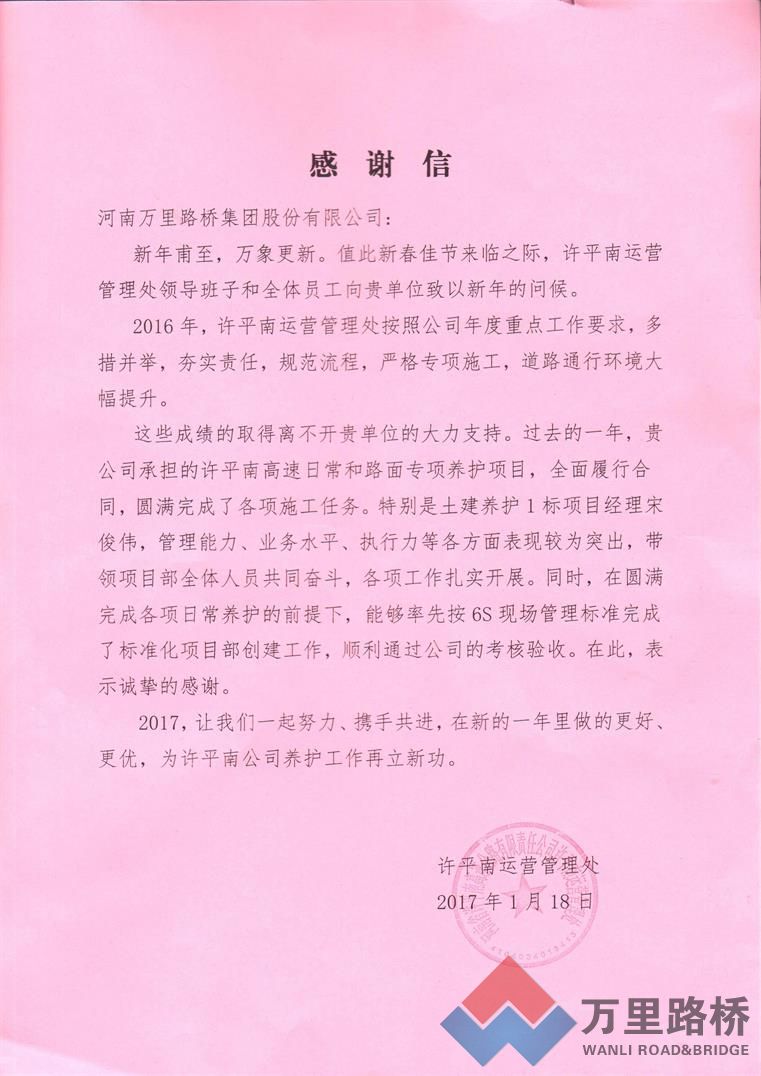 2016年,我公司承擔(dān)了許平南高速兩個(gè)標(biāo)段的日常養(yǎng)護(hù)工作及路面專項(xiàng)養(yǎng)護(hù)工程,全面履行合同,圓滿完成了各項(xiàng)施工任務(wù),大幅提升了許平南高速的路面通行環(huán)境。其中,許平南一標(biāo)項(xiàng)目經(jīng)理宋俊偉在管理能力、業(yè)務(wù)水平、執(zhí)行力等各方面表現(xiàn)突出,在圓滿完成各項(xiàng)日常養(yǎng)護(hù)的前提下率先完成6S標(biāo)準(zhǔn)化項(xiàng)目部的創(chuàng)建工作,順利通過(guò)業(yè)主考核驗(yàn)收,受到業(yè)主好評(píng)。